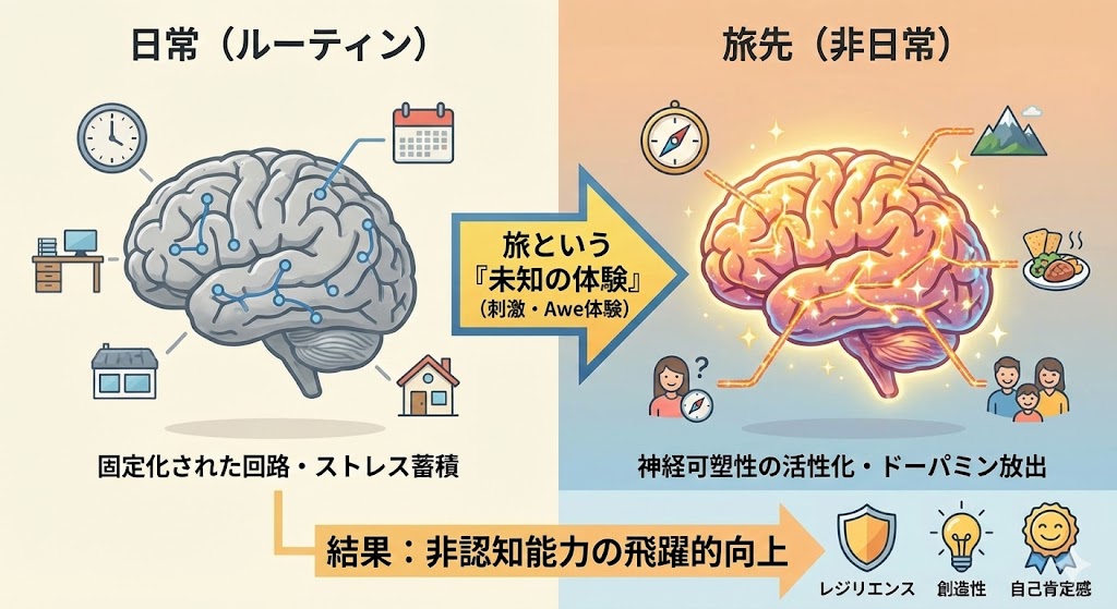 これは単なる個人の感想ではありません。脳科学、環境心理学、発達心理学、そして経済学。あらゆる分野の科学的データが、旅が人間にもたらす驚異的なメリットを証明しています。